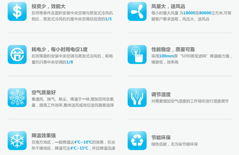 “科瑞萊”蒸發式冷氣機的核心降溫部件是“高效蒸發式濕簾”——純天然多層波紋植物纖維疊合物。根據“水蒸發吸收熱量,蒸發面積影響蒸發效率”這一自然物理現象,通過風機往室內送風,室外的新鮮空氣流經浸水的濕簾后空氣與水份充分接觸同時吸收空氣中的顯熱,從而達到降溫、換氣、除塵、增加室內空氣含氧量的目的,特別適用于高溫車間及人群密集的工作場所。